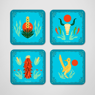 Coaster Size: 3.75 in x 3.75 in. Set includes 4 coaster designs featuring artwork by Jennifer Hernandez aka Squidly Designs.