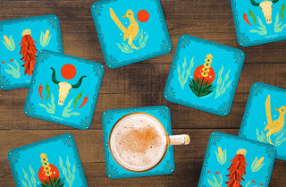 This beautiful mixed coaster set features four digital hand-drawn illustrations by Jennifer Hernandez, also known as Squidly Designs.